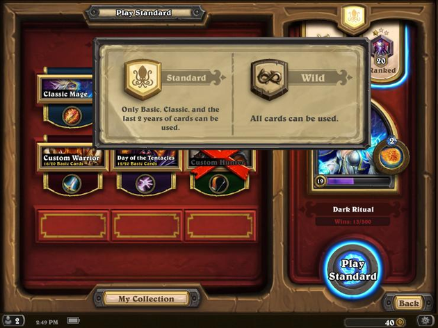 官方规定,除了基础和经典卡牌外,玩家只能在标准模式中使用最近一年内发布的卡牌,而原先的包含所有已发售卡牌的模式则被定义为狂野模式;发售超过一年的拓展包将会被归入狂野模式中。