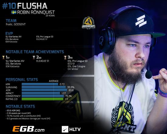 闯入top20第10名的选手是Robin “flusha” Rönnquist。作为瑞典乃至全世界知名的CS:GO选手,flsuha今年一共获得了5个EVP(其中4个为一线大赛),除此之外他的高ADR数据也帮助他顺利闯入前10。