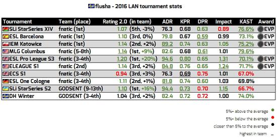 但flusha的排名之所以没能更高是由于他并非队内最佳的选手,在他们获胜的比赛里,flusha的影响力并没有其他队员大。但在他们输掉的比赛中,flusha的ADR又稳居队内第二,这说明flusha并不是战队的短板。只能说,flusha是一个智慧型选手,而非钢枪型选手。