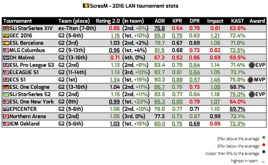 但Titan的战绩并没有改善,Titan在SLi StarSeries XIV联赛上止步8强。那也是ScreaM 2016年表现最差的比赛。不过当转会G2之后,ScreaM也开始爆发。在Game Show全球电竞挑战赛上,ScreaM是在G2打的11张地图中的三张上表现极佳,ADR为85.0,KAST为72.4%,至于rating则为1.15。