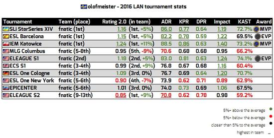 在接下来的ESL巴塞罗那站上,fnatic再度取得冠军,olof以1.15的rating获得了EVP。而在年初的重量级赛事IEM卡托维兹上,fnatic再度扫除了对手,olof的rating达到了惊人的1.24,拿到了他今年的第二个MVP,fnatic也拿到了自己今年的第三个大赛冠军。