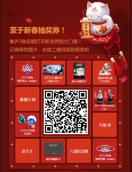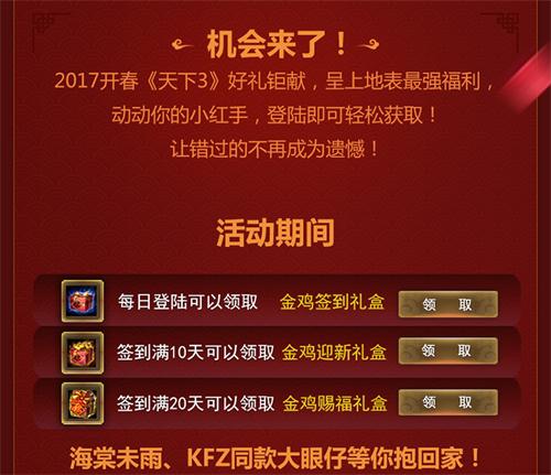 只要勤快,上线签到,就能获得新春抽奖券!而集齐三张抽奖券就将有机会抽到《天下3》经典手办、珍藏盒子,以及海棠未雨礼盒、《天下3》2017年嘉年华入场券等超级奖品!2017开门红,奖励丰富,事不宜迟,赶紧签到来一发吧!