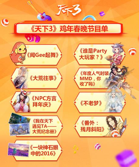 随着农历鸡年的临近,越来越多的玩家殷切期待着《天下3》2017年的线上春晚到底会带给大家怎样的惊喜。目前《天下3》2017鸡年春晚——“有种来Party”的节目单已经曝光,而且据知情人士爆料,《天下3》今年的大Party无论是开发组成员还是受邀的玩家,都是一众“颜高会玩”之人!事不宜迟,就让小编带各位抢先一探今年春晚的神秘节目单,一起看看今年春晚的大Party究竟有多好玩、多好看吧!