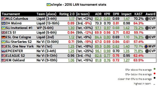 但s1mple没能走向更高的排名,在于他不稳定的发挥。在top20选手中他的KAST只有69.1%,是最不稳定的几人之一。而在不同的赛事中,他的表现同样起伏不定,有三场赛事中他的rating低于1.00。