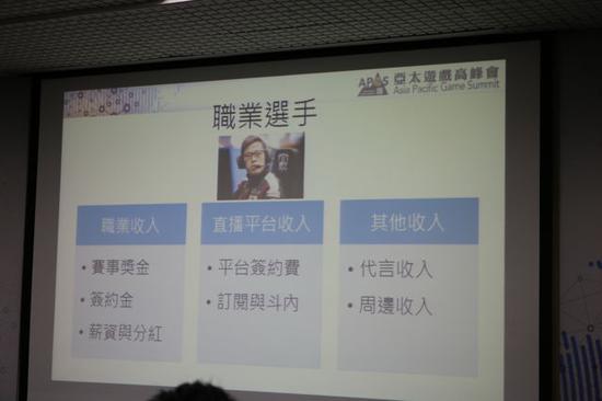 职业选手整体收入有职业、实况、其他,且每年以倍数成长。陈柏寿特别强调,选手的收入与战绩成正比。针对竞争激烈的实况方面,陈柏寿指出,现在实况在中国已经是一片红海了,去年还是蓝海,但在台湾认为还是蓝海。