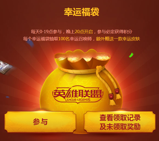 A:每天的0:00-19:00是幸运福袋的参与时间,20:00开放领取奖励,已参与的玩家可以来领取奖励,必须到页面来点击参与与领取你的奖励哦。