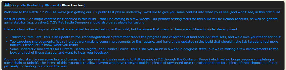 大部分7.2的主要内容还没有在这个补丁中开放,它们将在数周后开放。我们对于这个补丁的主要测试点是恶魔入侵,以及一些总体的游戏稳定性(比如崩溃)。7.2的宠物对战地下城应该也可以进行测试。