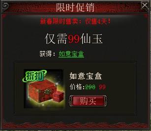 活动2:1月24日至1月27日,多宝阁出售如意宝盒,打开如意宝盒将获得一个彩石精华(禁交易),更可以开出各类时装和道具,也有机会开出珍稀座驾。