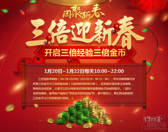 今日,《英雄联盟》迎来了2017年春节活动。这次活动将有5000万份永久皮肤免费领,春节期间,参与《英雄联盟》的各项春节活动均有机会获得活动积分,累计积分可以升技新春福袋,并在2月3日开启福袋领取永久皮肤奖励。除此之外,1月20日-1月22日期间游戏还有三倍金币与经验奖励。