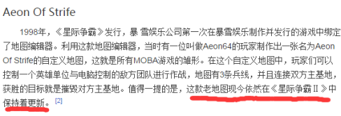 另外这里多提一句,关于MOBA的百度词条中曾经指出:这张远古地图依然《星际争霸2》中保持着的更新。好奇心驱使,我们曾通过星际争霸2的游戏客户端进行验证,经过搜索之后,Aeon Of Strife没有找到,倒是发现了一张名叫Aeon Of Storms的类Dota地图,虽说命名上仅有一字之差,但无论是玩法还是整体风格上都相去甚远,翻遍所有相关资讯也找不到两者有所关联的证据。