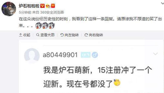 因此确切来说,也许真的有少数高端玩家感觉损失并没有得到充分补偿,但对于大部分玩家来说,其实可能是赚了,1000G加15卡包,可不是闹着玩的,更别提很多人两天什么都没有做,直接免费得到这些丰厚补偿了。不过,影响期间新建的炉石号是完全没有了,在微博看到的,真的忍不住想笑。