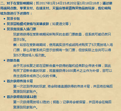 最终,在经过长达41小时的维护之后,玩家们终于可以进入游戏了,不过事情并没有完全解决,官方宣布:备份服务器也发生故障,只能将游戏数据回档至2017年1月14日15:20。也就是说,从14号下午3点到维护之前,所有我们获得的东西——卡牌、金币、天梯等级、竞技场胜利等等都没有了,当然你消耗的东西——金币以及所开的卡包等也将恢复原样。