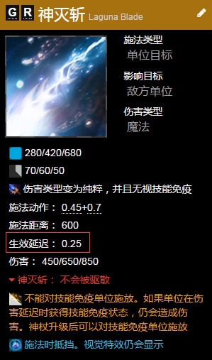 英雄做完施法前摇的动作后,技能会立刻作用于英雄,然后经过0.25秒延迟后,再造成伤害。