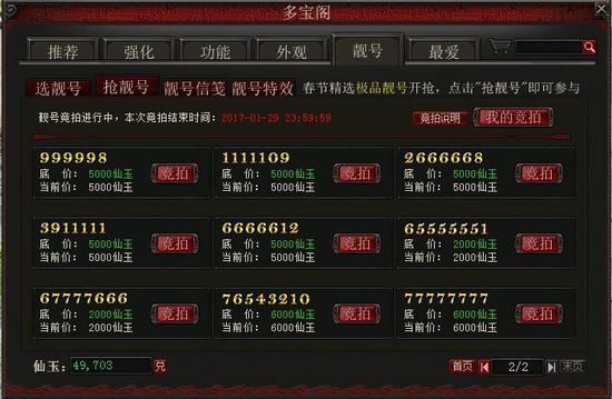 《大话西游2免费版》新春多宝送福,四大福利活动贺新年!活动1:靓号拍卖活动火热开启,更有18888以及999998两个绝世靓号现世;活动2:多宝阁出售如意宝盒,打开可得一个彩石精华(禁交易),更可开出各类时装和道具,也有机会开出珍稀座驾;活动3:两款限量时装吴钩、绮梦上架,男装帅气挺拔,女装妩媚柔情;活动4:新年新气象,两款以中国红为基调打造的全新时装司晨、寄春火热上线。
