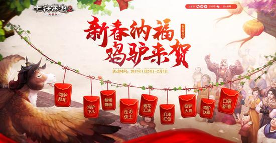 1月24日至2月3日,《大话西游2免费版》2017春节活动“新春纳福·鸡驴来贺”火热开启,鸡驴大神携九大趣味玩法陪你红红火火过大年,珍稀神兽、黄宝石、八荒遗风、聚魄丹、高级古阵残页等海量福利大放送!