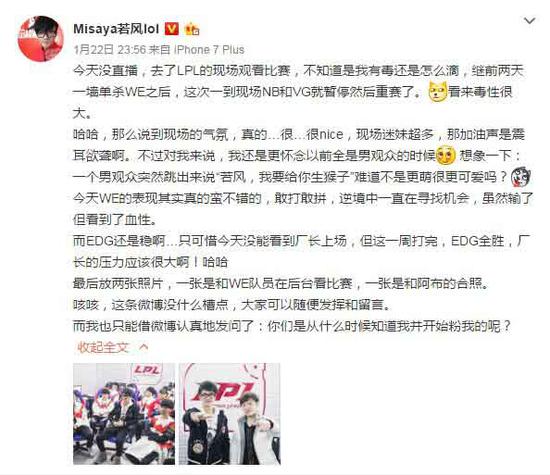 上一场WE的比赛,若风送个墙让WE被翻盘,不过好在最后一局WE还是赢了。但若风似乎没有要轻易放过WE的意思,在昨晚对阵EDG的比赛中,若风更是亲临现场坐镇。