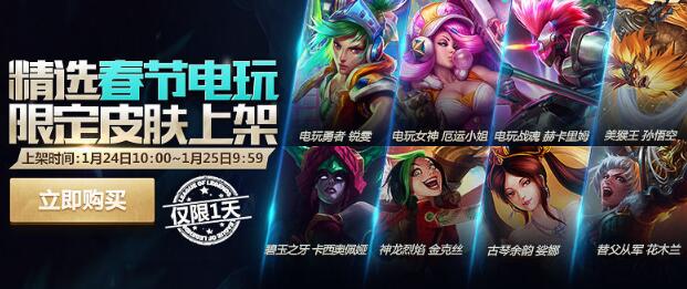 英雄联盟LOL公布了2017精选春节电玩皮肤限时上架,仅售一天(1月24日10:00~1月25日9:59!都有哪些皮肤上架呢?赶紧来看看吧!