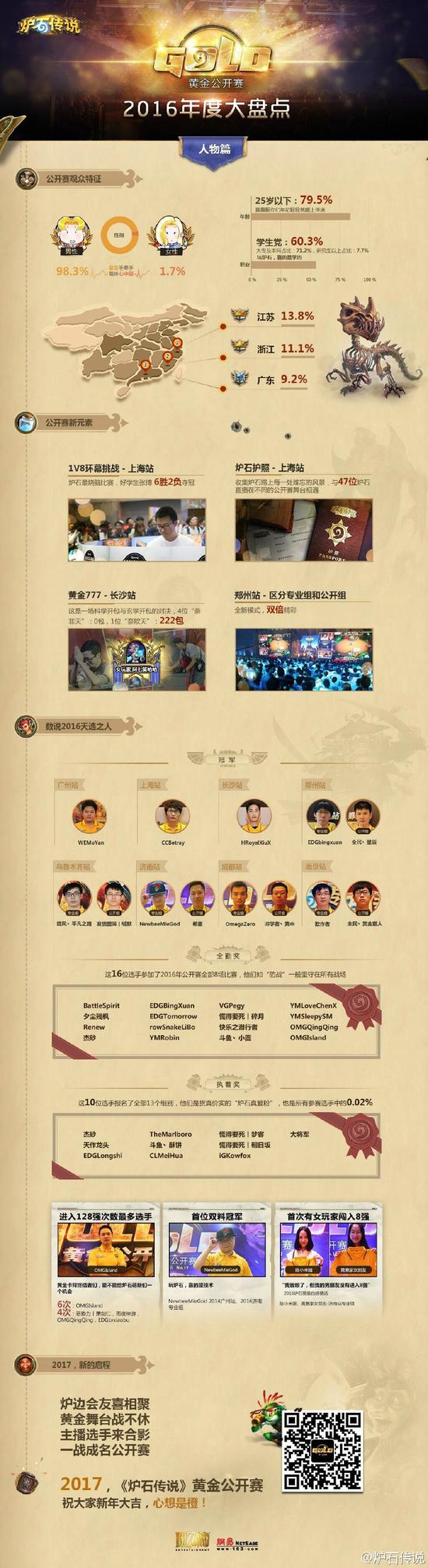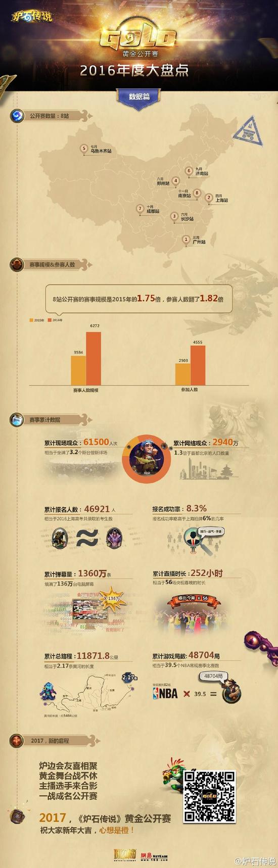 2017《炉石传说》黄金公开赛首站将于3月10日-12日在合肥举行。这也是黄金公开赛举办以来的第20站,本站比赛参赛规模将扩充到1024人,比赛报名将于2月10日正式开启,敬请期待。在过去的2016年里,黄金公开赛得到了大家的热情支持,不妨来回顾一下过去一年的精彩数据吧!