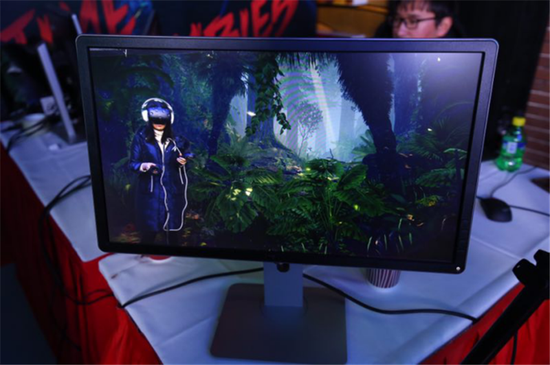 年会现场,VR体验馆不得不看,VR studio公司带来了最新的无线、全动态的虚拟现场软/硬件解决方案,运用头显、摄像头、交互设备,呈现了《方舟公园》中的恐龙世界,让体验者感受到一个深度沉浸的游戏环境。