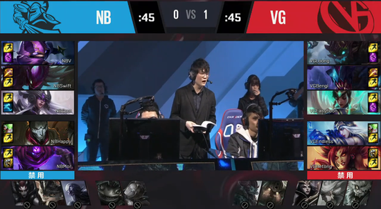 首场比赛中,进入比赛画面。VG战队身处蓝色方,NB战队身处红色方。BP方面,VG战队BAN了流浪法师、扭曲树精、诡术妖姬、未来守护者、寒冰射手;祭出了上单机械公敌、打野虚空遁地兽、中单暗黑元首、ADC伊泽瑞尔、辅助厄运小姐的常规输出阵容。NB战队BAN了蜘蛛女皇、傲之追猎者、青钢影、戏命师、惩戒之箭;祭出了上单深海泰坦、打野盲僧、中单王牌飞行员、ADC皮城女警、辅助荆棘之兴的均衡输出阵容。