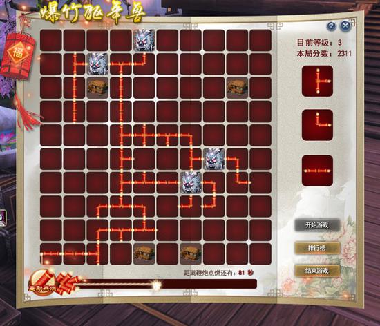 首先我们在南门或者是轩辕乡找到春节鞭炮使进入游戏,游戏分为多个难度~每通关一个难度后就会进入下一关。