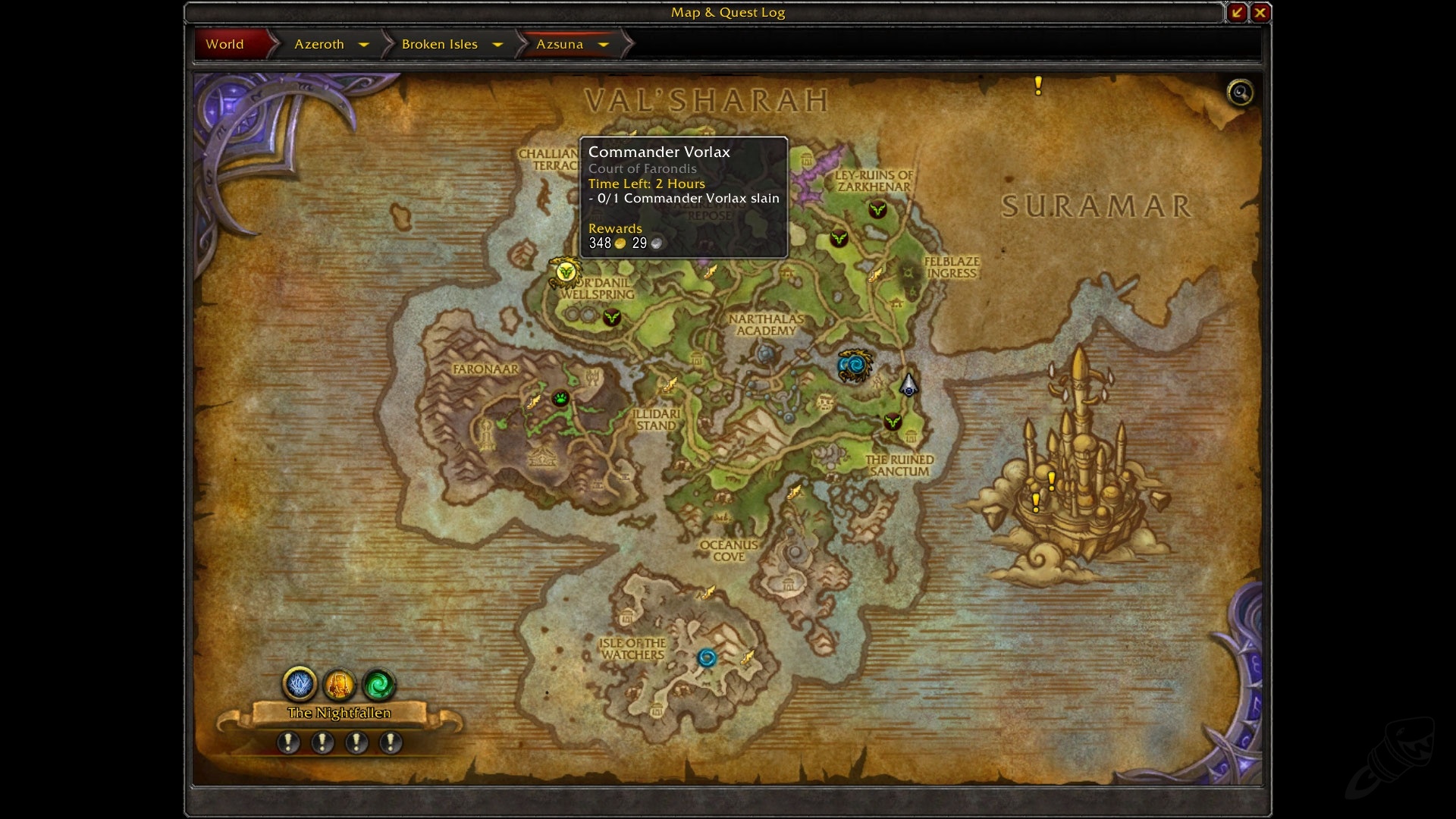 军团入侵事件会在任意一张图上出现。比如任务:入侵瓦尔莎拉。入侵事件开始后,这张地图会被恶魔占领,我们的世界任务也会被一些恶魔主题任务取代。我们在瓦尔莎拉看到了下面这些任务: