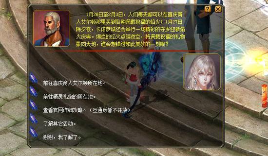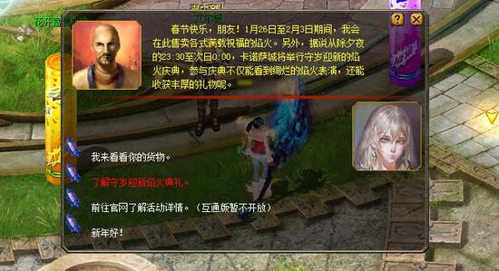 1、春节期间,拜访金鸡迎春特使凯恩斯(344,399)了解活动详细信息。 2、1月26日至2月3日期间,可以向喜庆商人艾尔顿(196,423)购买焰火礼包。这些焰火可在活动期间燃放,营造美好节日气氛;超期后再使用,则获得经验值补偿。 3、1月27日23:30至次日0:00,卡诺萨城复苏之泉(202,417)附近的精灵礼炮每隔10分钟便会燃放一次焰火,并抛撒出满载节日祝福的鸿运焰火礼盒。 4、1月27日23:50至次日00:00,精灵礼炮每分钟都会发射一次焰火,同时周围会散落装有丰厚节日礼物的守岁迎新大礼包。
