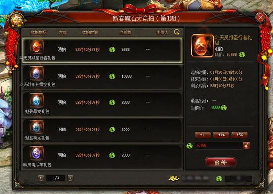 参与新春大竞拍需要使用魔石。做好准备的你,找到魔石竞拍特使就可以争夺自己看中的竞拍品了。千万别大意,好东西可多了,想要的人也不少哦,这真是比拼实力的时候了。只要分别在1月28日23:59、1月31日23:59、2月3日23:59时,保持着最高的出价记录,就可以赢得当期竞拍品的拥有资格。