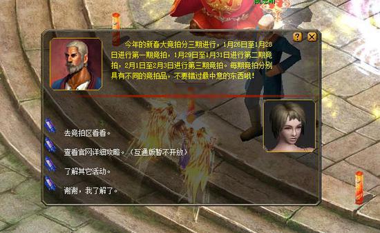 1、节日期间,与卡诺萨城里的金鸡迎春特使凯恩斯(344,399)对话,了解春节系列活动的相关信息。 2、找到卡诺萨城广场区负责主持新春竞拍的魔石竞拍特使(271,458),用魔石参加竞拍。只要分别在1月28日23:59、1月31日23:59、2月3日23:59时,保持着最高的出价记录,就可以赢得当期竞拍品的拥有资格。 3、胜出者所赢得的竞拍品,将通过邮件系统送达。