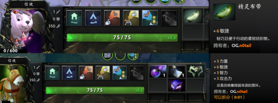 但说句实话,我并没有感觉到这种小技巧会在实战中有非常显著的效果。顶多是在信使被杀的时候能有一个替代品,避免出现了大哥装备一直拿不到的情况。且在其他战队的比赛中,我们都没有发现与之相似的战术。因此据我估计,“双鸡战术”可能是OG队内讨论得出的结果。大爹或许就是一个用鸡特别频繁的选手,而且他有强迫症,不拿到装备就不打架。于是Fly没办法,只能迁就大爹,再给他单独买一个鸡。其实当前版本信使的价格也不是特别高,对于辅助来说,100块钱能让自家Carry安心Farm——这笔钱,花的值。