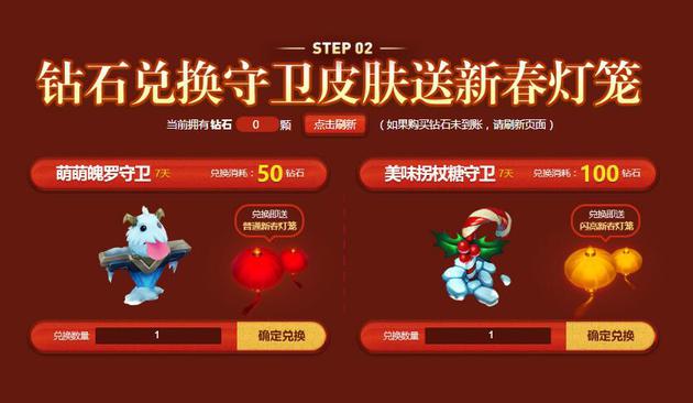 2、使用钻石兑换守卫皮肤,其中50钻石兑换一份“萌萌魄罗守卫(7天)”,将获得赠“普通新春灯笼”一份;100钻石兑换一份“美味拐杖糖守卫(7天)”,将获得赠“闪亮新春灯笼”一份。兑换多份珍稀守卫皮肤,使用时间叠加计算。