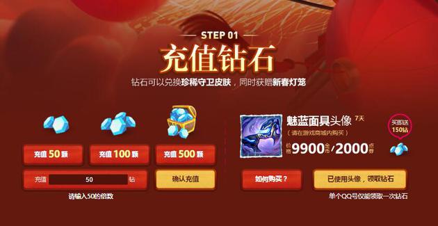 1、在活动页面上使用Q币充值钻石,5Q币充值50钻石。在游戏客户端购买并使用魅蓝面具头像,赠送150钻石,单个大区头像只限购买一次。充值的钻石会在页面上显示。