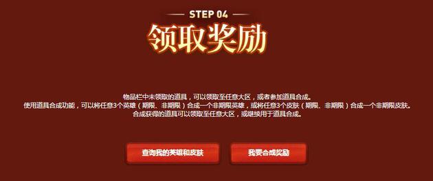7、道具栏中未领取的道具,可以参加道具合成。道具合成功能可以将道具栏中任意3个英雄(期限、永久)合成一个随机永久英雄,任意3个皮肤(期限、永久)合成一个随机永久皮肤。合成出的道具可以领取到任意大区,也可以继续参与合成。