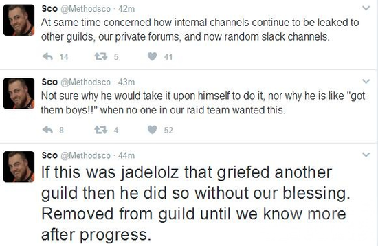 Method会长Sco发推解释Method并不知晓,并将此人已经踢出公会,待开荒结束后处理。不过Serenity公会主力坦克Slooty仍然通过推特表示此人是受Method公会指示。