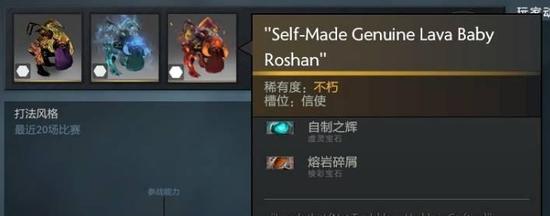 ▲ 寒冰Roshan宝宝 ▲需要注意的是,下面这个熔岩Roshan宝宝的虚灵宝石是“自制之辉”,这个虚灵宝石是Valve赠与已被采纳饰品设计师的,也很少见,应该是账号主人自己打上去的。这个宝石貌似没有特效,但由于小编孤陋寡闻没有亲眼见过,也不好下结论。