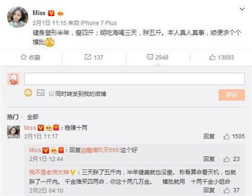 每逢佳节胖N斤已经成为春节假期之后小伙伴们相互调侃最高频的一句话。那么2017年春节,胡吃海喝的你究竟胖了多少斤呢?近日,虎牙直播大咖明星主播Miss就在微博中给自己写了一道对联“健身塑形半年,瘦四斤;胡吃海喝三天,胖五斤。本人真人真事,顺便求个个横批。”于是脑洞大开的网友们纷纷开始挥洒笔墨,接下来让我们一起欣赏粉丝们的文采。