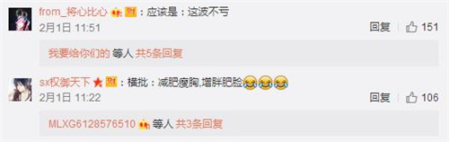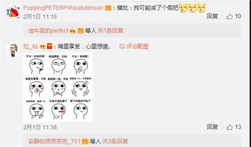 还有暖心网友为了安慰大小姐给出“稳赚不赔” “这波不亏”等横批,仔细算一算,Miss还赚了一斤肉,厉害了我的姐。过年虽然没有压岁钱可以炫耀,但我们可以非常自豪的告诉全世界,我长肉了!