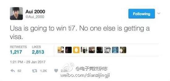 而DOTA2作为一项国际性竞技项目,每年都有大量外国战队需要办理美国签证参加比赛。对此,2000哥发推称:“美国战队将赢下TI7冠军,因为没人签证能过了。”
