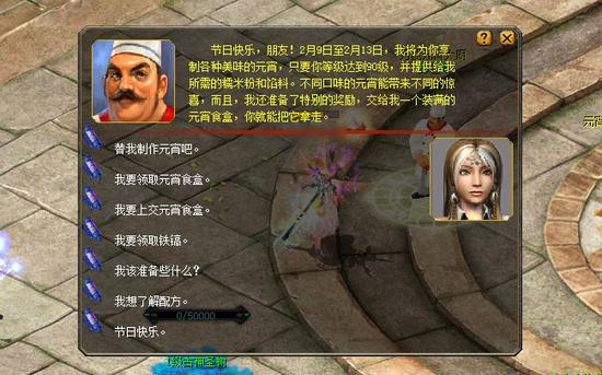 1.2月9日至2月13日,找卡诺萨城的万能元宵大厨彭巴斯(338,370)了解制作各种美味元宵所需的材料,并获得必要的工具,以及空的元宵食盒。 2。 根据万能元宵大厨彭巴斯的提示,收集各种必需的食材。 3。 带着收集到的食材回到万能元宵大厨彭巴斯处,他会帮助你烹制美味的元宵。 4。 将全部5种口味的元宵装进空的元宵食盒中,并将装满的元宵食盒交给万能元宵大厨彭巴斯,即可获得元宵欢庆礼包:注意!每天的元宵欢庆礼包只有100份,先到先得,领完即止哦! 5。 此外,直接品尝万能元宵大厨烹制的元宵,也可以获得攻击力加成、金钱收益或是神之祝福之类的奖励。