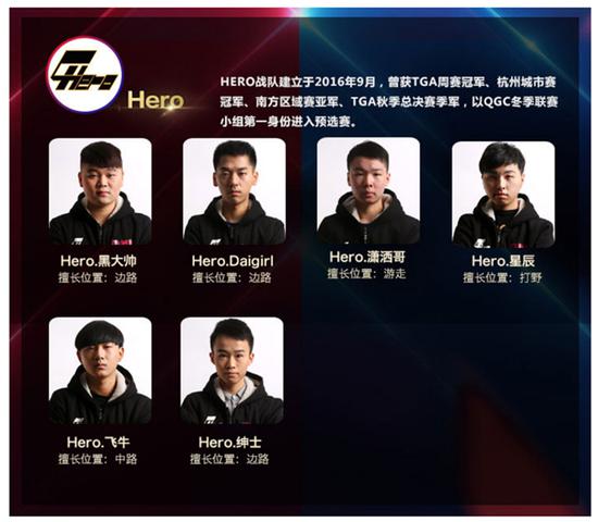 2016年9月,Hero战队所有成员召唤到位,坚硬上单潇洒哥,创造高亢的辅助数据并擅长分割战场;王牌射手黑大帅,专注射手100年,用孙尚香、马可波罗与后羿四方收割;百变刺客飞牛,可抗可打可输出,随时准备游走线上;飘逸中单Daigirl,主打不知火舞与小乔,乃扇子大师;还有野区小霸王星辰,进出战场潇洒自如,专怼敌方后排输出。五名有血性的选手为了同一个目标出征,从王者城市赛到TGA、QGC,他们活跃在各大赛事之上,曾获TGA周赛冠军、第二届王者城市赛杭州站冠军、南方区域赛亚军、TGA秋季总决赛季军,最终以QGC冬季联赛小组第一身份进入预选赛。而在近期举行的QGC冬季联赛总决赛中,Hero更是以3:0的绝佳战绩战胜YTG,问鼎总冠军。
