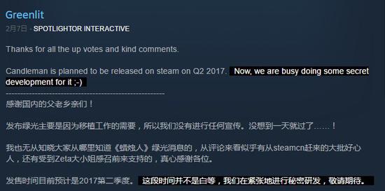 对此,制作团队也在社区界面发布了公告,感谢了来自国内外玩家的支持,直言没有想到竟然能够在这么短的时间内通过绿光,并表示游戏将会在2017年第二季度正式发售,而在此之前他们也会进行一些秘密的开发。
