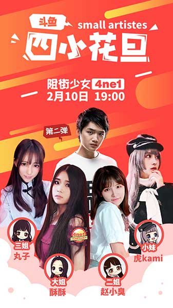 大家还记得由“酥酥、赵小臭、丸子和虎kami”四位美女主播组成的“阻街少女4ne1”吗?其实她们还有另一个外号,那就是“斗鱼四小花旦”。