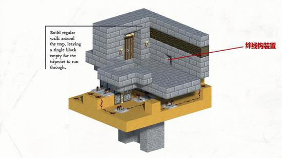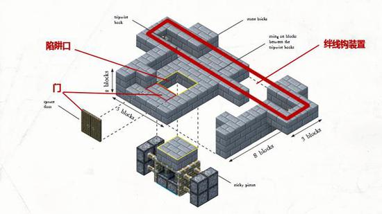 这个陷阱主要由三个装置组成,上层为房屋与一个绊线钩装置,下层为红石装置与粘性活塞装置。当入侵者即将进入房屋时,他们只需碰触到门口的绊线钩,隐藏陷阱就会开启,入侵者会直接掉入陷阱口,冒险家们可以瞬间将入侵者消灭于无形!