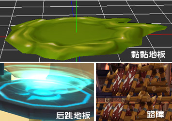副本内有3种游戏妨碍物“黏黏的地板”、“后跳地板”和“路障”。