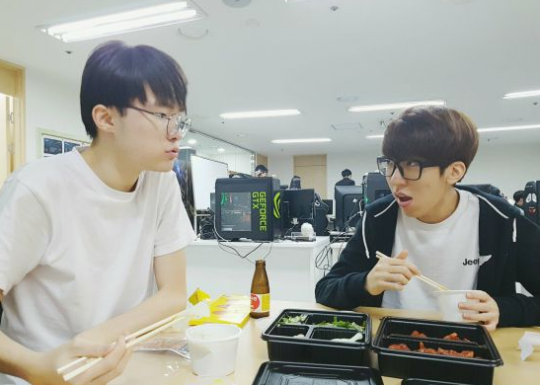 这几张照片拍摄于几天前,当时SKT_T1的队员们正在进行赛前调整,准备晚间对阵Afs的比赛。照片中可以看到,SKT_T1的训练室装潢非常朴素,装饰也非常简单,除了高配置的机器以外,其他地方基本上就和学校机房别无二致。而大魔王Faker也就在训练室找了张桌子和队友们一起用餐。