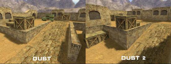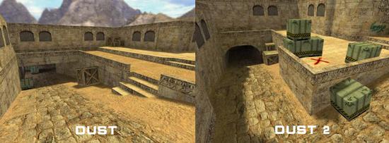 《军团要塞2》地图(左)与Dust(右)对比开阔的视野以及明亮的视觉体验,使得Dust深受玩家的喜爱,并且地图简单明了,十分适合新手学习游戏规则,因此迅速成为了游戏中最热门的一张地图。随后这张地图还出现在了CS的各个版本中,画质得到了不断改进。