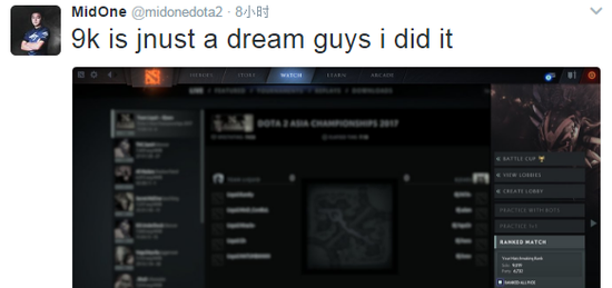 昨天Secret战队的马来西亚中单选手MidOne天梯分顺利突破9000分大关,又一位9000岁选手诞生。