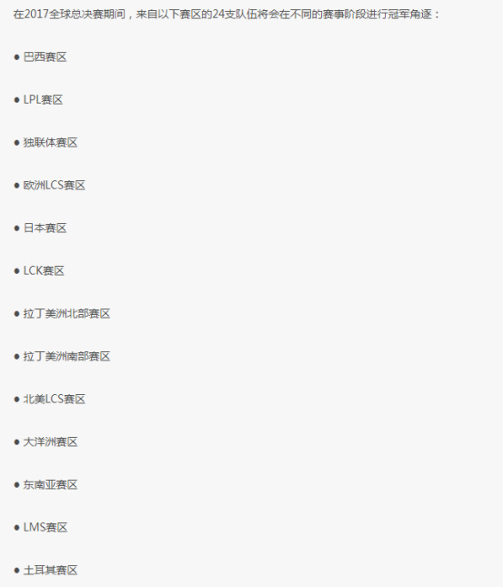 往年仅仅把参赛队伍限制在五个大区显然是不公平的,队伍繁多的外卡赛区仅有两个名额也显然有失公平。所以这次拳头干脆把“外卡赛区”给“删除”。拳头在保留原有的5大赛区的基础上,将以前统称的外卡赛区分成了繁细的8个赛区,所以今年S7世界赛中我们可以看到多达13个赛区一起角逐世界冠军。