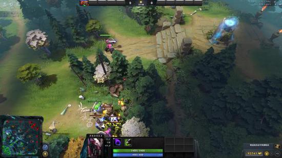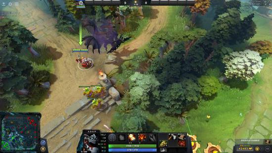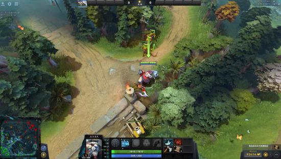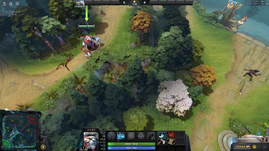 打破图中位置齿轮,向坡上走去。由于路上存在障碍,且并未构成“原地不动等待障碍消失”的判定条件,兵线会稍微避开,想从高坡侧两棵树之间过去。此时发条在坡上与远古相遇,兵线会被远古勾走。
