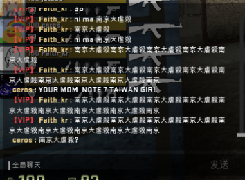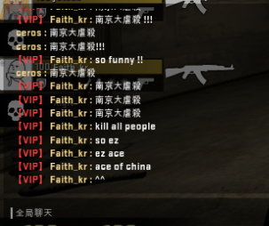 2017年2月11日,一场长达40多分钟的CSGO比赛成为当天中国电竞玩家所关注的焦点:韩国MVP战队成员XigN在游戏中与国服玩家产生口角之后,其队友ceros以及Faith_kr在游戏公共频道多次输入“南京大屠杀”字样进行嘲讽,态度极其恶劣。